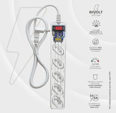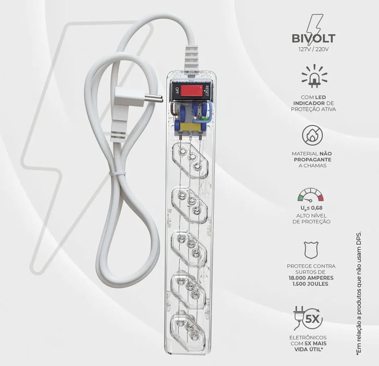 O iCLAMPER Energia 5 não é apenas um filtro de linha; é um protetor contra surtos certificado, o que o diferencia da esmagadora maioria dos produtos encontrados em lojas de varejo. Ele é fundamental para quem mora em regiões com instabilidade elétrica, quedas constantes de energia ou alta incidência de raios. A tecnologia de DPS é a única que protege efetivamente seu equipamento contra a principal causa de danos: surtos elétricos de alta tensão vindos da rede.